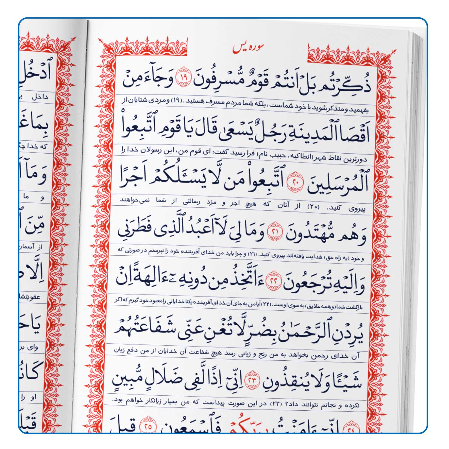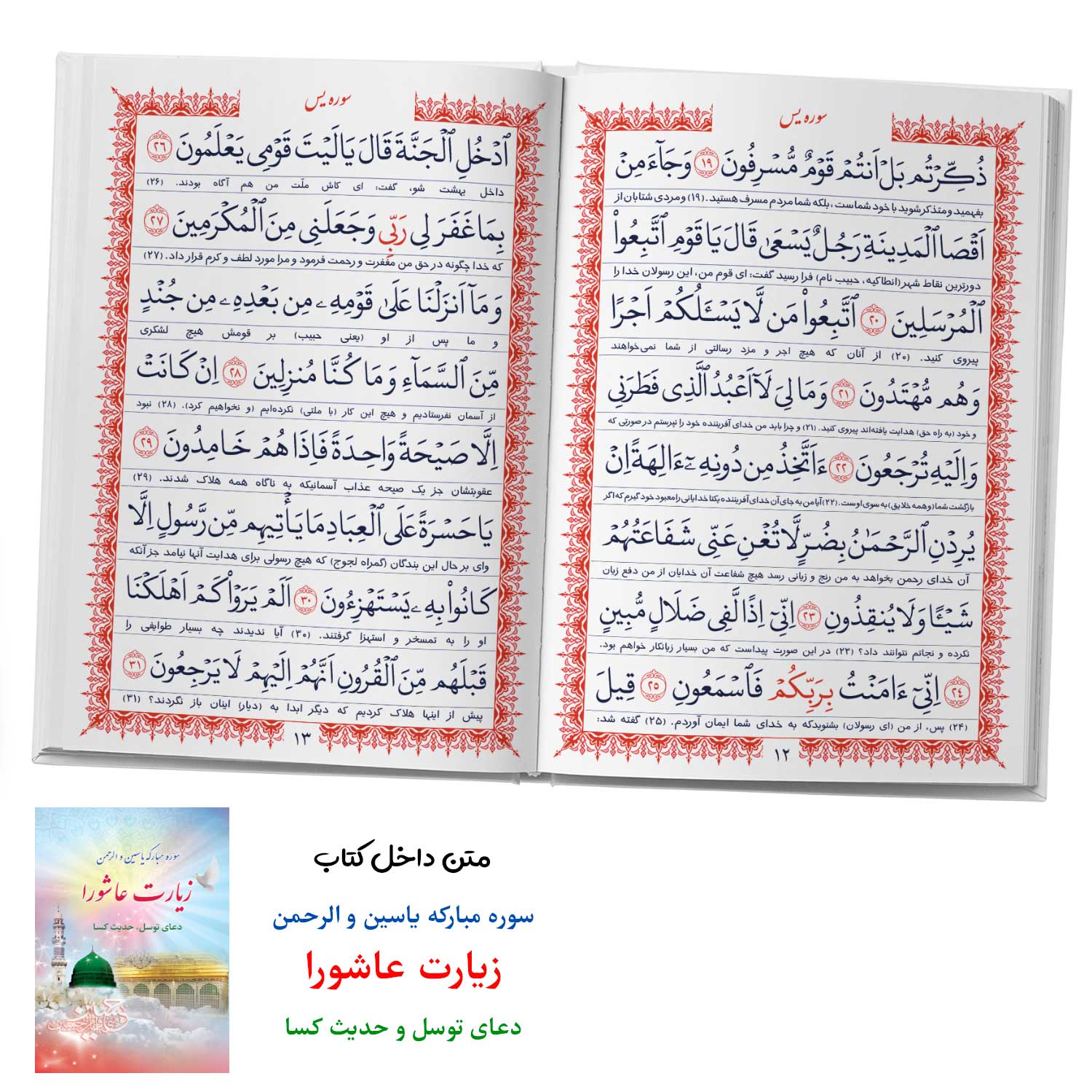 داخل کتاب سوره مبارکه یاسین و الرحمن زیارت عاشورا دعای توسل حدیث کسا به صورت دو رنگ چاپ شده است.